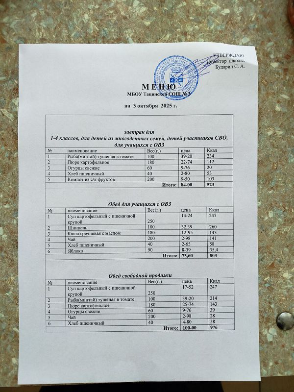 Сегодня 03.10.25 для учащихся 1-4-х классов предусмотрено следующее меню на завтрак: рыба (минтай), тушеная в томате, пюре картофельное, огурцы, помидоры (свежие или соленые), хлеб пшеничный, компот из сухофруктов.