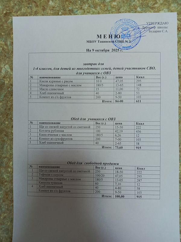 Сегодня 09.10.2025 г. для учащихся 1 – 4 классов предусмотрено следующее меню на завтрак: кнели куриные с рисом, макароны отварные с маслом, масло сливочное, хлеб пшеничный, компот из с/х фруктов.