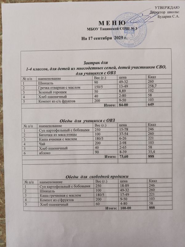 Сегодня 17.09.25 для учащихся 1-4-х классов предусмотрено следующее меню на завтрак: шницель, каша гречневая, зеленый горошек, хлеб пшеничный, компот из сухофруктов.