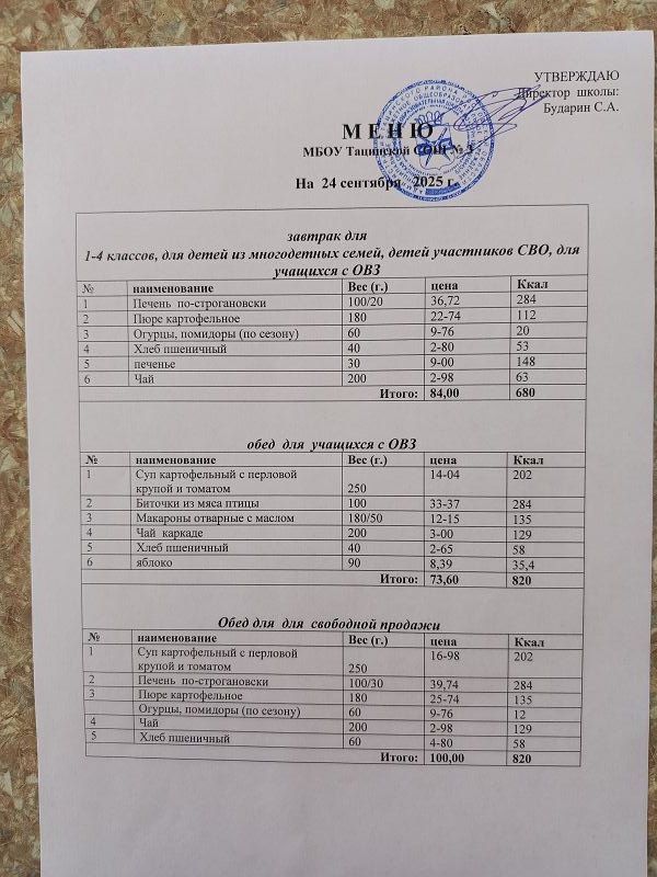 Сегодня 24.09.25 для учащихся 1-4-х классов предусмотрено следующее меню на завтрак: печень по-строгановски, пюре картофельное, огурцы, помидоры (по сезону), хлеб пшеничный, печенье, чай.