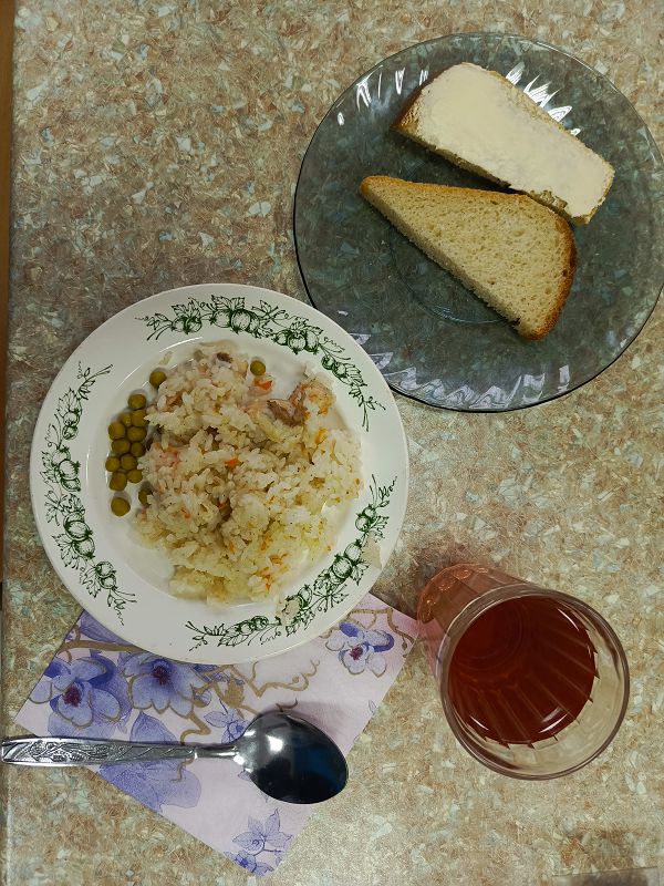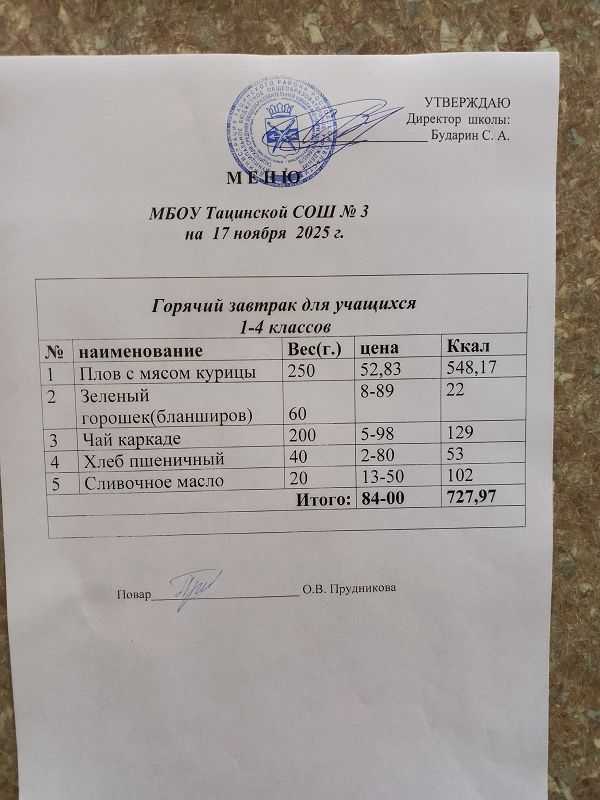 Сегодня 17.11.25 для учащихся 1-4-х классов предусмотрено следующее меню на завтрак: плов с мясом курицы, зеленый горошек, чай каркаде, хлеб пшеничный, сливочное масло.