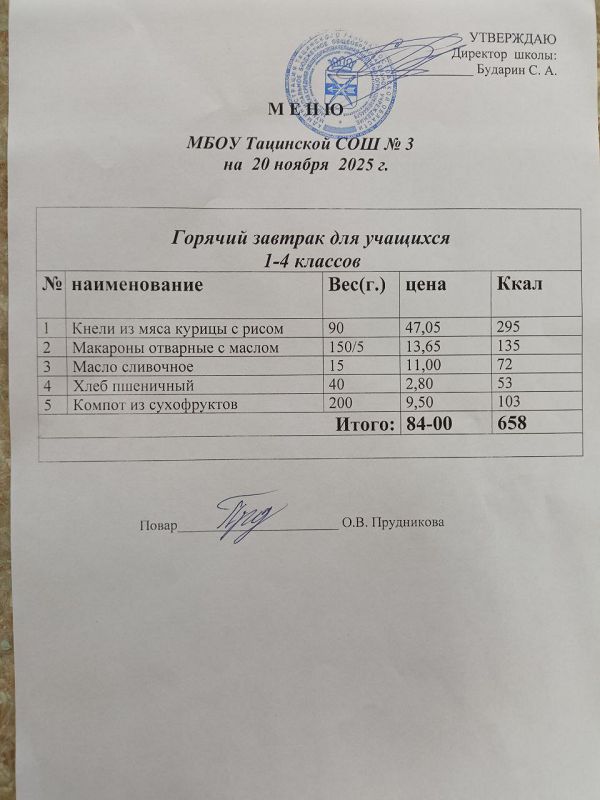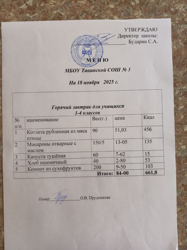 Сегодня 18.11.25 для учащихся 1-4-х классов предусмотрено следующее меню на завтрак: котлета рубленая куриная, макароны отварные с маслом, капуста тушеная, хлеб пшеничный, компот из с/х фруктов.