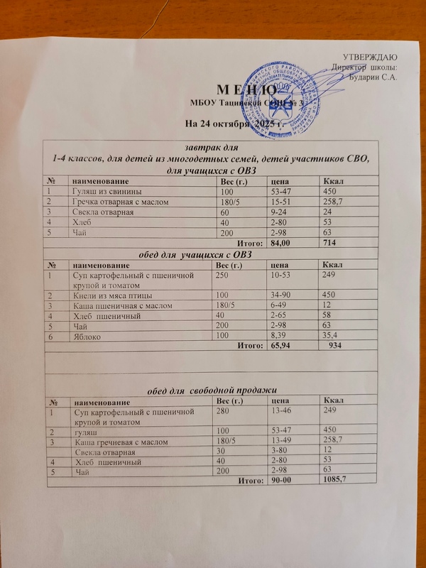 Сегодня, 24.10.2025 г. для учащихся 1 – 4 классов предусмотрено следующее меню на завтрак: гуляш из свинины, гречка отварная с маслом, свекла отварная, хлеб, чай.