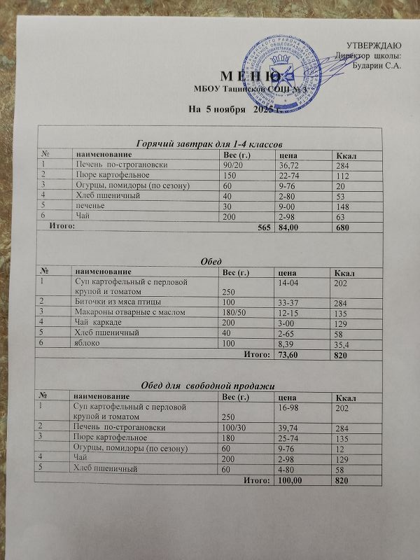 Сегодня 05.11.25 для учащихся 1-4-х классов предусмотрено следующее меню на завтрак: печень по-строгановски, пюре картофельное, огурцы, помидоры (по сезону), хлеб пшеничный, печенье, чай.