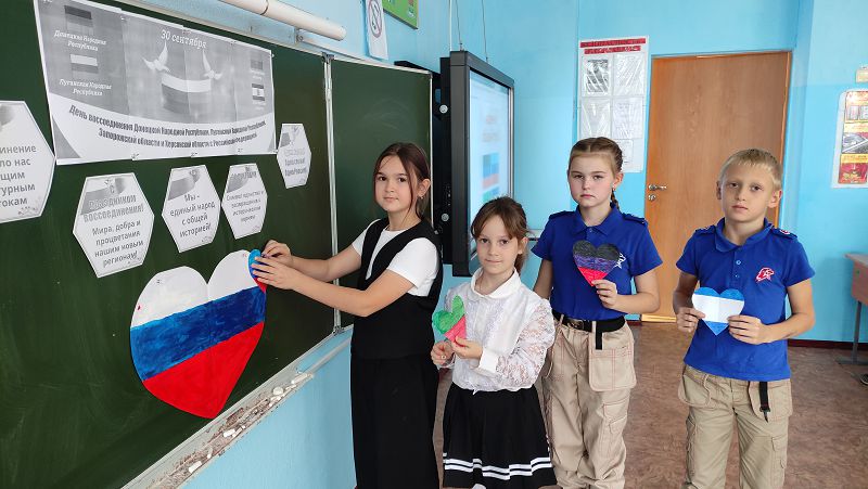 29 сентября в 4-б классе прошёл классный час, посвященный Дню воссоединения ДНР, ЛНР, Запорожской и Херсонской областей с Россией.