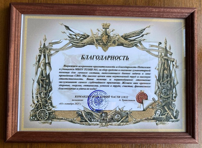 В этом учебном году мы продолжаем нашу работу. В адрес директора школы получены благодарственные письма, подписанные командиром войсковой части 31832 полковником А.Трапезниковым и начальником медицинской службы войсковой части 11744 Л. Горобец. Учащихся и педагогов школы благодарят за активную деятельность, направленную на оказание гуманитарной помощи военнослужащим, выполняющим боевые задачи в зоне проведения СВО.