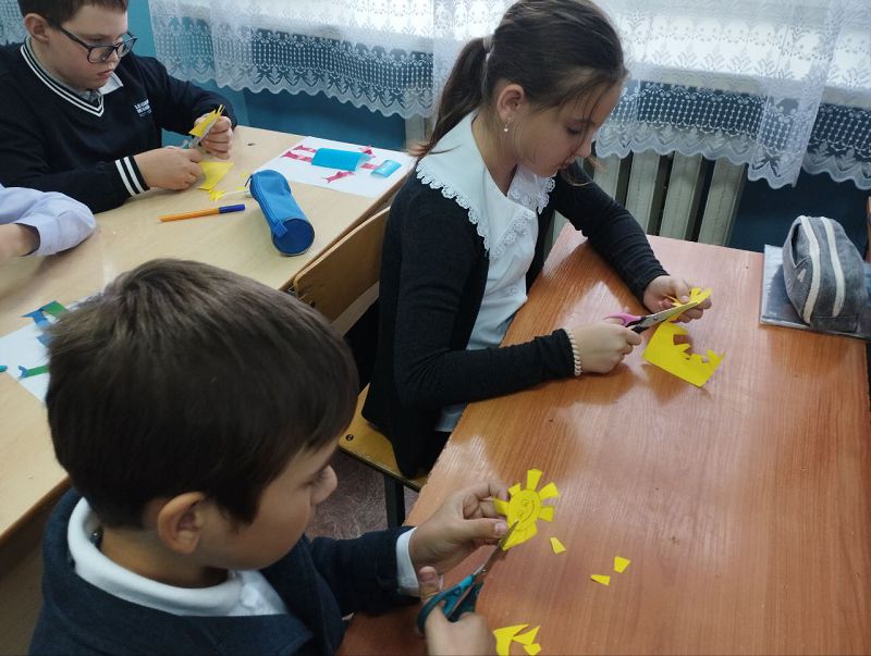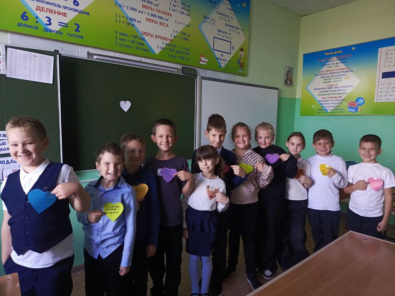 Учащиеся 4 - а класса поделились друг с другом солнышками, на лучиках которого написали пожелания своим друзьям. А ученики 2-а класса обменялись сердечками с добрыми пожеланиями. В 4 - б классе, используя технику коллажа, отразили в работах свои ощущения, ценностные отношения и убеждения. Самое яркое фото получилось у дружного 2 – б класса.