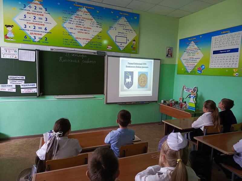 Ученики познакомились с государственной символикой родного края — флагом, гербом и гимном. Ребята узнали, что трёхцветный флаг области символизирует единство трёх народов: синий цвет — донские казаки, жёлтый — калмыки, красный — русские, а белая полоса у древка — связь с Россией.