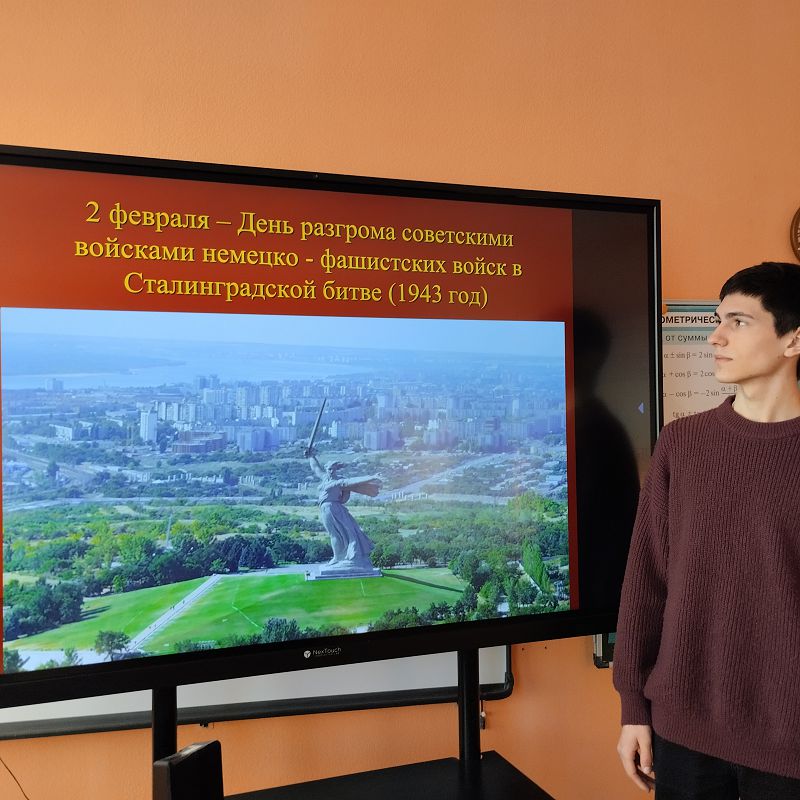 2 февраля в 11 классе прошел классный час на тему: «2 февраля — День разгрома немецко-фашистских войск под Сталинградом». Ребята вспомнили о том, как развивались события зимой 1943 года. В 2026 году будут отмечать 83 года со дня разгрома немецко-фашистских войск под Сталинградом.