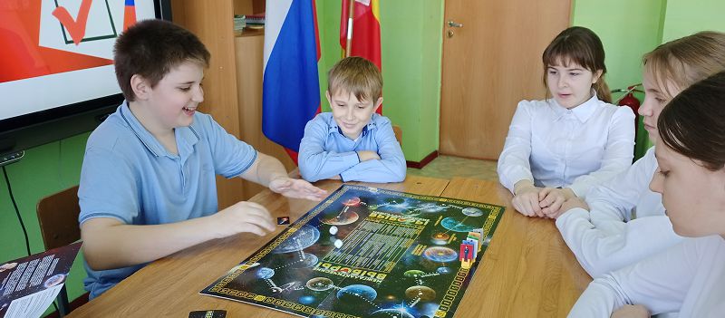 В рамках проведения месячника молодого избирателя сегодня семиклассники стали участниками настольной образовательной игры «Межгалактические выборы». Цель игры – набрать наибольшее количество рейтинговых очков и победить на выборах президента галактики Демократус.