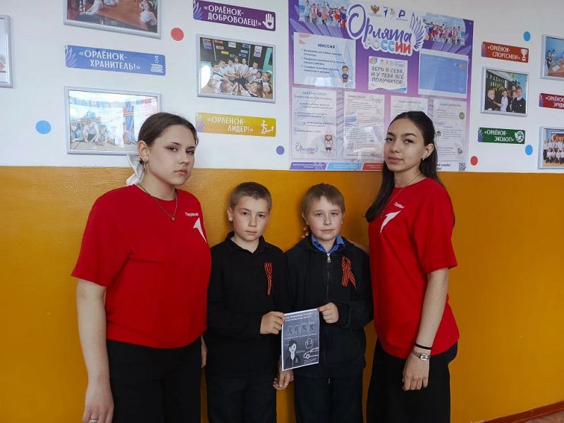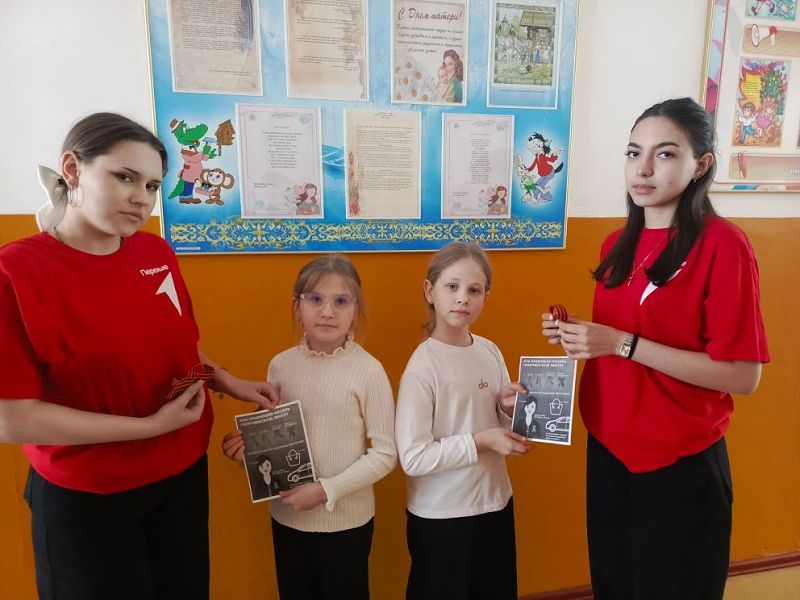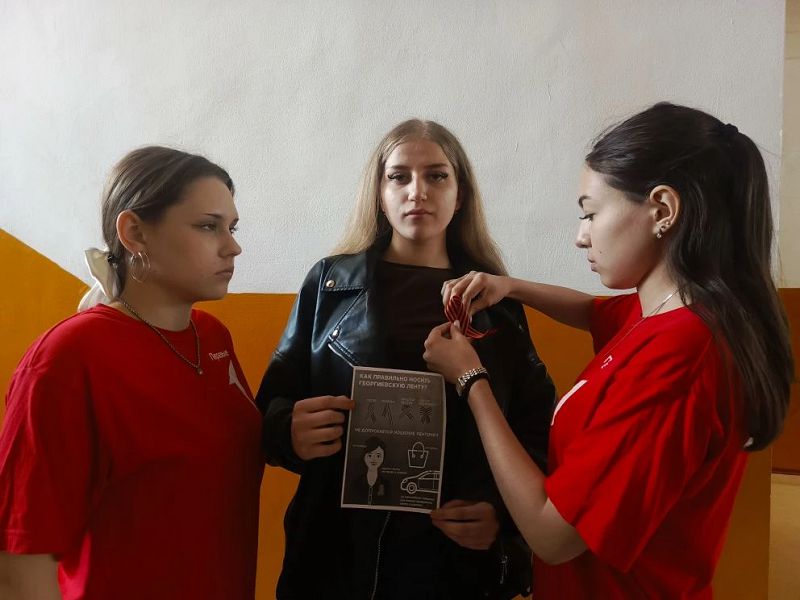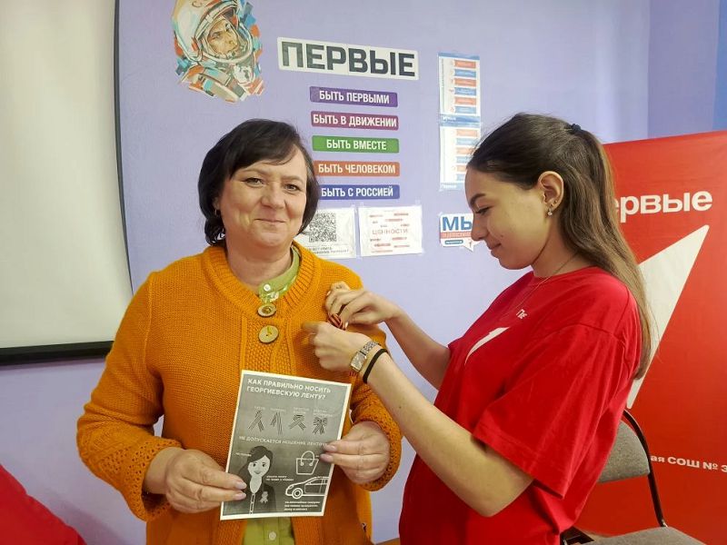 Активисты движения первых с гордостью раздавали учащимся и педагогам георгиевские ленточки — символ воинской доблести и памяти о подвиге наших предков. Вместе с ленточками участники получили информационные памятки с правилами ношения георгиевской ленты