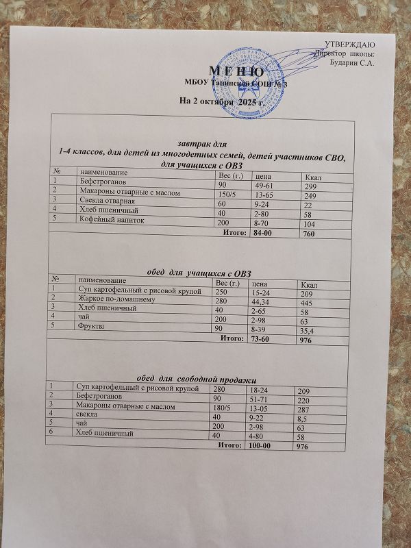 Сегодня 02.10.2025 г. для учащихся 1 – 4 классов ТСОШ №3 предусмотрено следующее меню на завтрак: бефстроганов, макароны отварные с маслом, свекла отварная, хлеб пшеничный, кофейный напиток.
