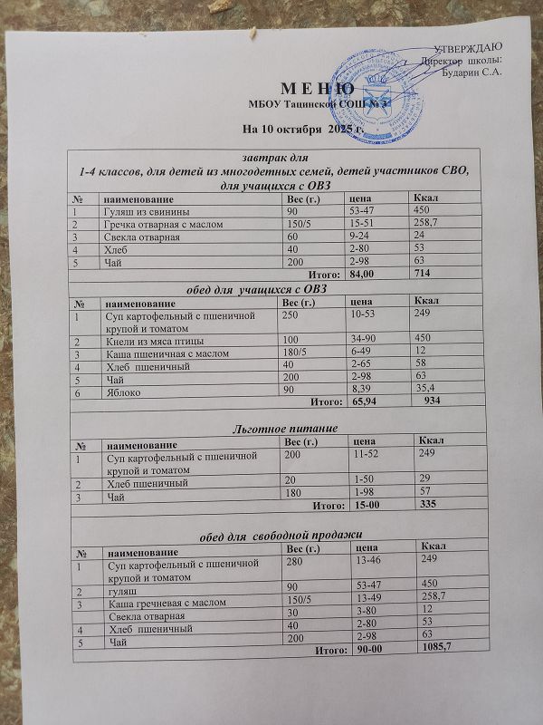 Сегодня, 10.10.2025 г. для учащихся 1 – 4 классов предусмотрено следующее меню на завтрак: гуляш из свинины, гречка отварная с маслом, свекла отварная, хлеб, чай.