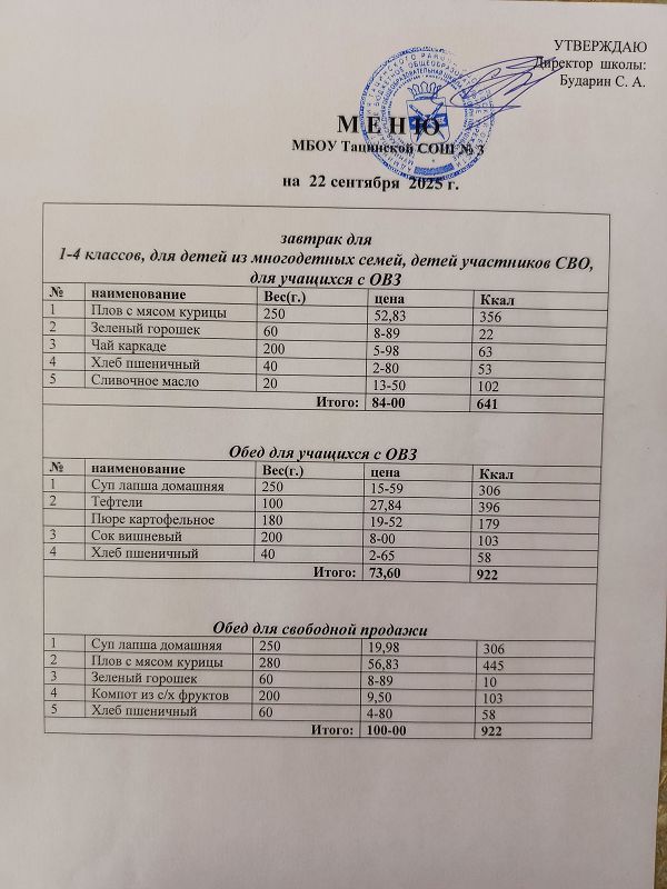 Сегодня 22.09.25 для учащихся 1-4-х классов предусмотрено следующее меню на завтрак: плов с мясом курицы, зеленый горошек, чай каркаде, хлеб пшеничный, сливочное масло.