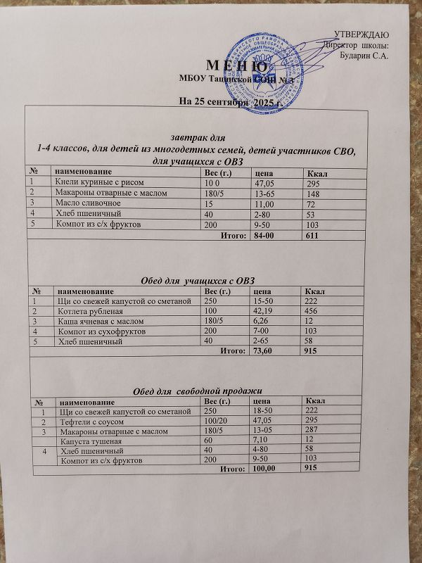 Сегодня 25.09.2025 г. для учащихся 1 – 4 классов предусмотрено следующее меню на завтрак: кнели куриные с рисом, макароны отварные с маслом, масло сливочное, хлеб пшеничный, компот из с/х фруктов.
