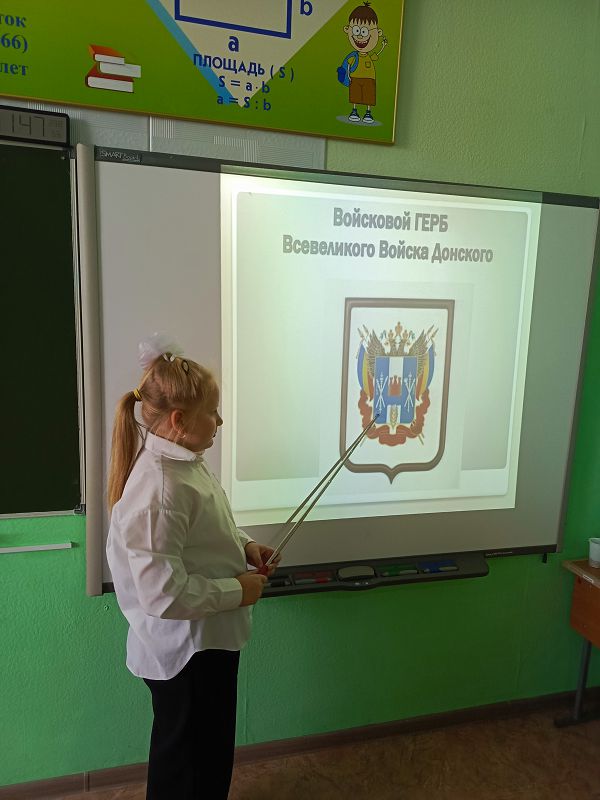 Ученики познакомились с государственной символикой родного края — флагом, гербом и гимном. Ребята узнали, что трёхцветный флаг области символизирует единство трёх народов: синий цвет — донские казаки, жёлтый — калмыки, красный — русские, а белая полоса у древка — связь с Россией.