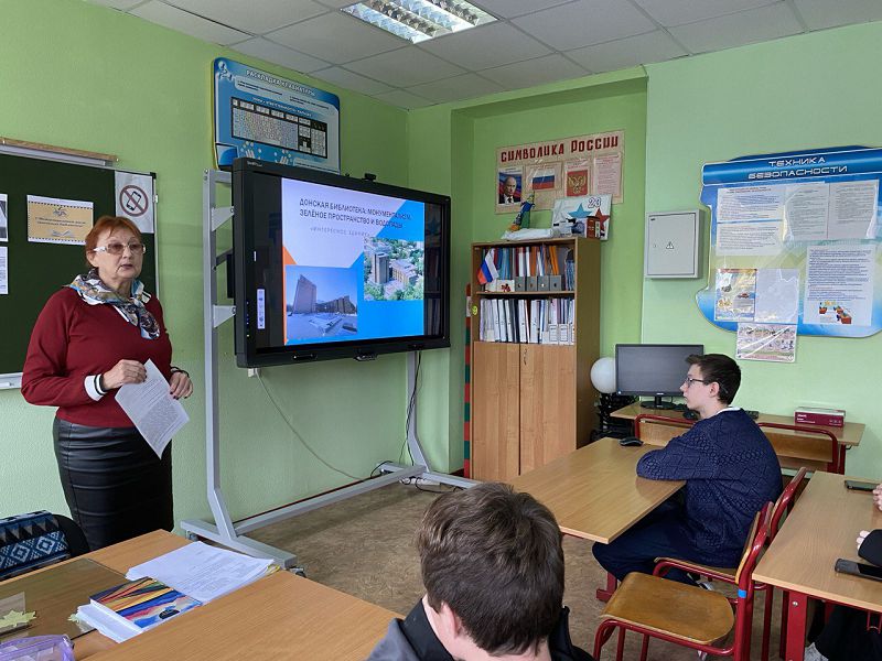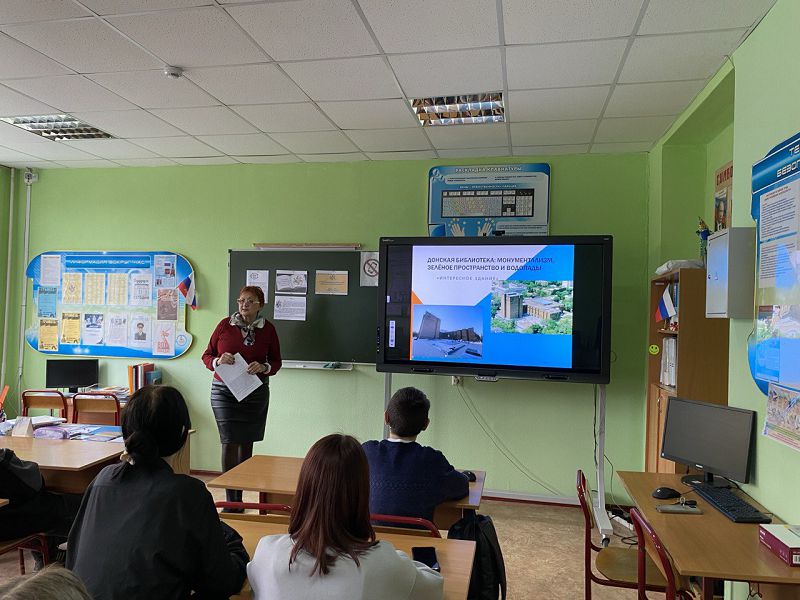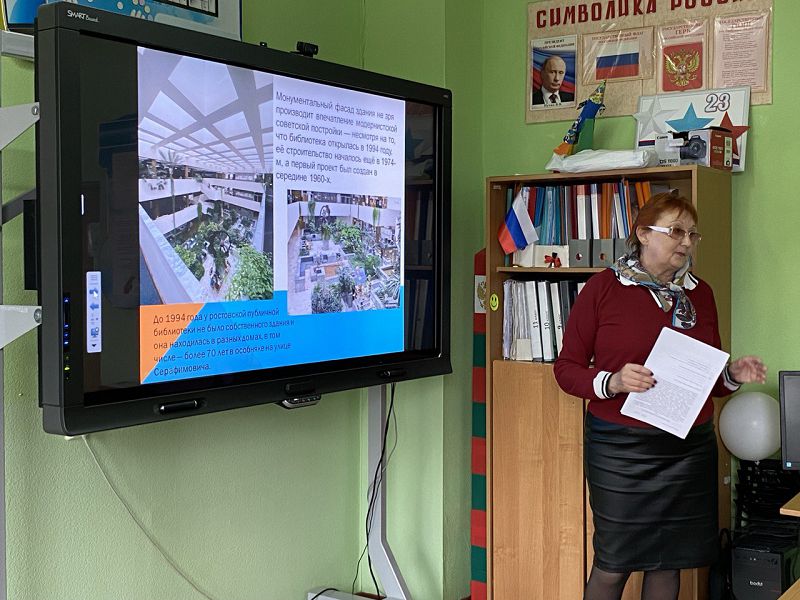 Педагог-библиотекарь Отраднова Капитолина Георгиевна совместно с советником по воспитанию Светланой Юрьевной Агеевой провели для учащихся 9-б класса виртуальную экскурсию по крупнейшей среди Центральных библиотек субъектов Российской Федерации - Донской государственной публичной библиотеке. Девятиклассникам было интересно узнать о старейшем книгохранилище Юга России, важном городском культурном центре и, конечно, шедевре архитектуры.