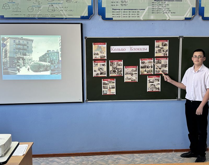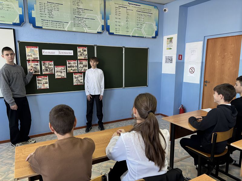 26 января в предверии памятной даты, дня снятия блокады Ленинграда, в 7а,б классах прошёл тематический классный час, посвящённый тяжёлым дням блокадного Ленинграда. Классные руководители Майорова С.В. и Гринева Т.В. и педагог – библиотекарь Отраднова К.Г. рассказали о важных событиях блокады, жизни и подвигах защитников и горожан.