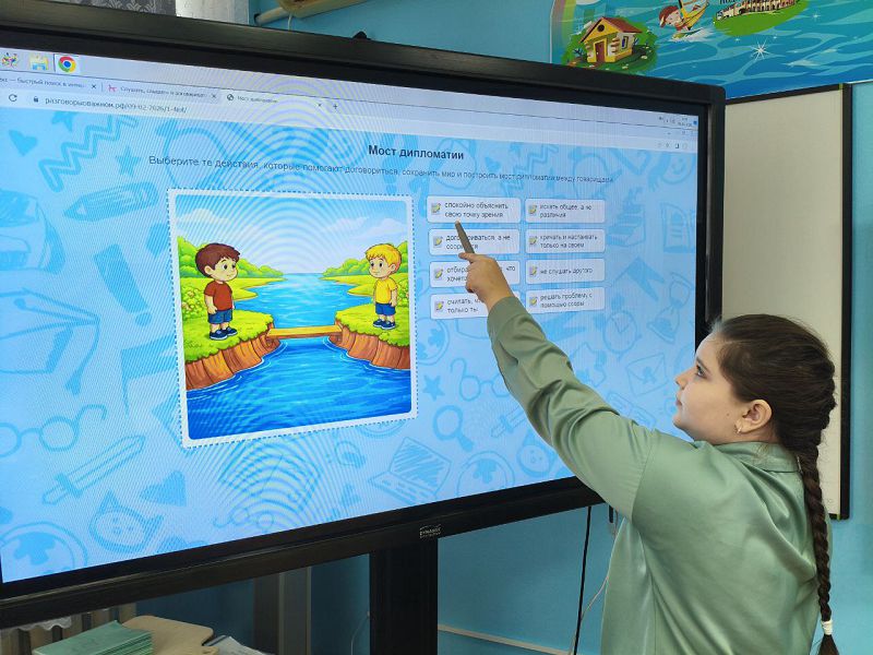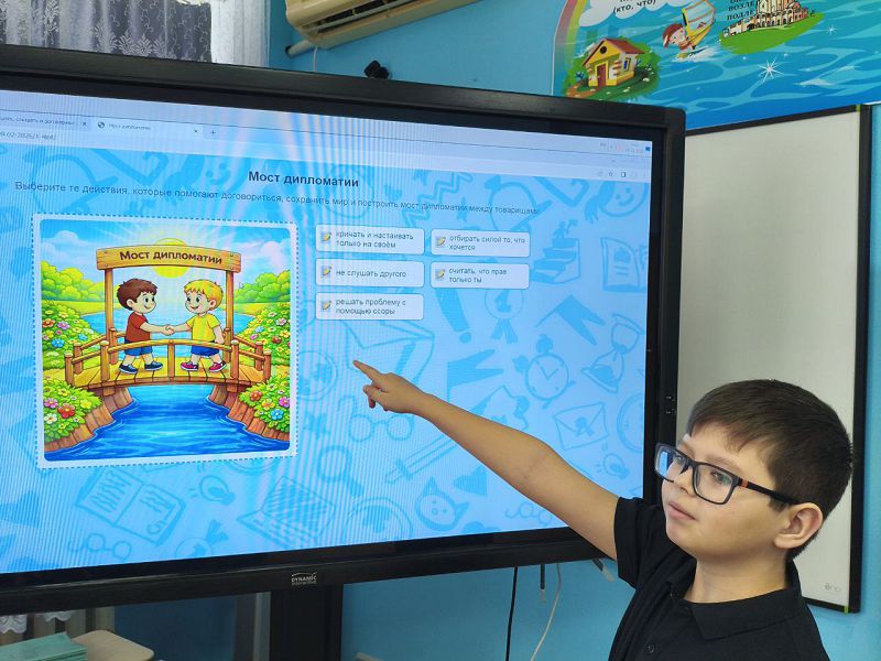 Начальная школа погрузилась в мир дипломатии в доступной и игровой форме. Учителя объясняли, кто такие дипломаты и какие качества помогают им в работе. А интерактивное задание «Мост дипломатии» помогло ребятам выбрать действия, которые помогают договориться и сохранить мир.