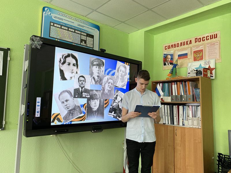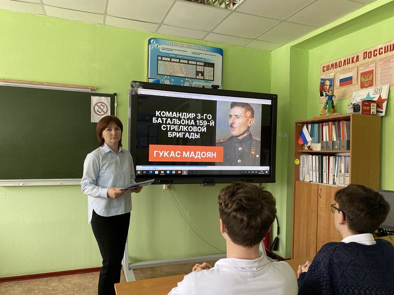 О героях, которые ценой собственной жизни защитили город Ростов-на-Дону, шла речь на уроке. Ребята узнали о Гукасе Мадояне и его шестидневной обороне ростовского вокзала. Александре Нозадзе, которая за отвагу и храбрость, проявленную в боях за Ростов, посмертно была удостоена ордена Красной Звезды. О деятельности местных мстителей – партизанском отряде юговцев и юных партизанах из отряда Трифонова (Югова)
