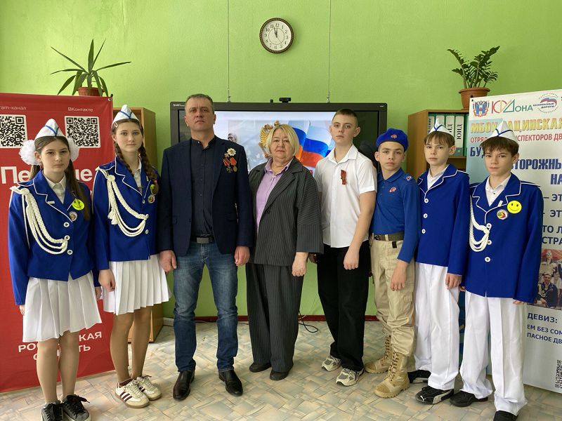 Участники встречи узнали о том, как и когда СССР, Российская Федерация оказывала военную помощь дружественным государствам. Более подробно остановились на войне в Афганистане и Чечне. Язепов В.О. рассказал о своем боевом пути. Дети с интересом слушали историю подвига, который совершил Вячеслав. Будучи тяжело ранен, он сумел вывести из-под обстрела БТР, тем самым спас боевых товарищей. Вячеслав награжден орденом Мужества.
