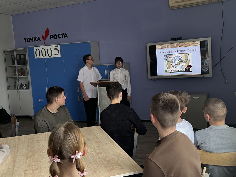 Классные руководители Гринева Т.В. и Майорова С.В. представили краткий обзор исторических фактов и важных событий полуострова, рассказали об истории возвращения Крыма в Российскую Федерацию, отметили что Крым — это не просто географическая точка на карте, а важная часть нашей идентичности, исторического наследия и стратегического развития. В ходе классного часа ребята совершили виртуальное путешествие по Крыму, увидели красоту полуострова, познакомились с культурой и экономикой. В завершении школьники активно отвечали на вопросы викторины, посвященной воссоединению Крыма с Россией. Они убедились в неповторимости нашей удивительной страны, поговорили о мужестве нашего народа, в независимости от национальности.
