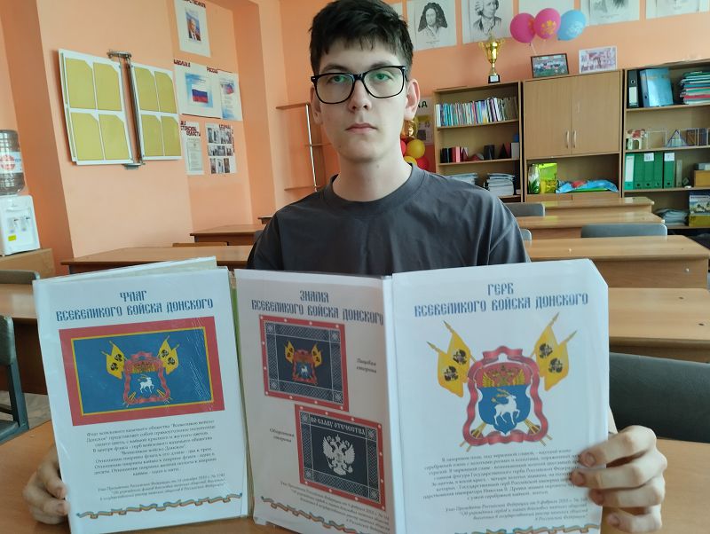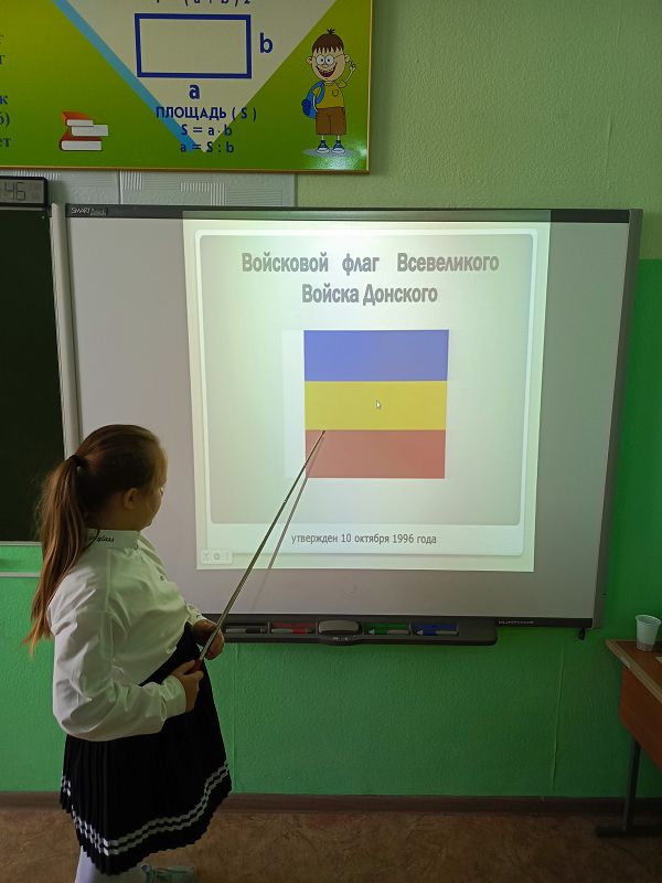 Ученики познакомились с государственной символикой родного края — флагом, гербом и гимном. Ребята узнали, что трёхцветный флаг области символизирует единство трёх народов: синий цвет — донские казаки, жёлтый — калмыки, красный — русские, а белая полоса у древка — связь с Россией.